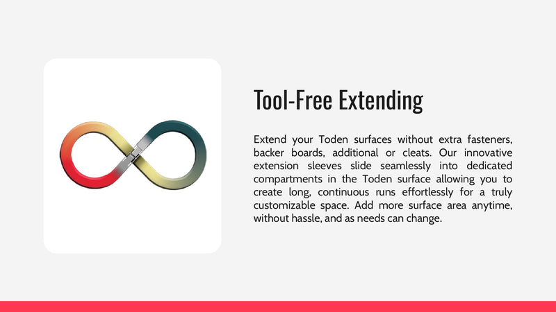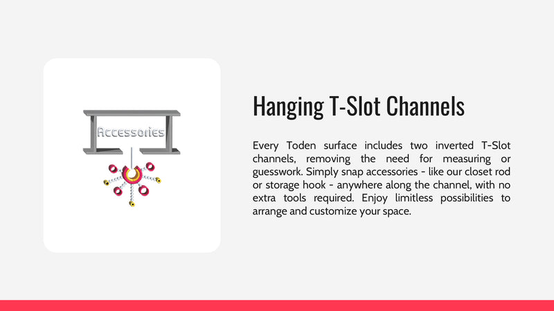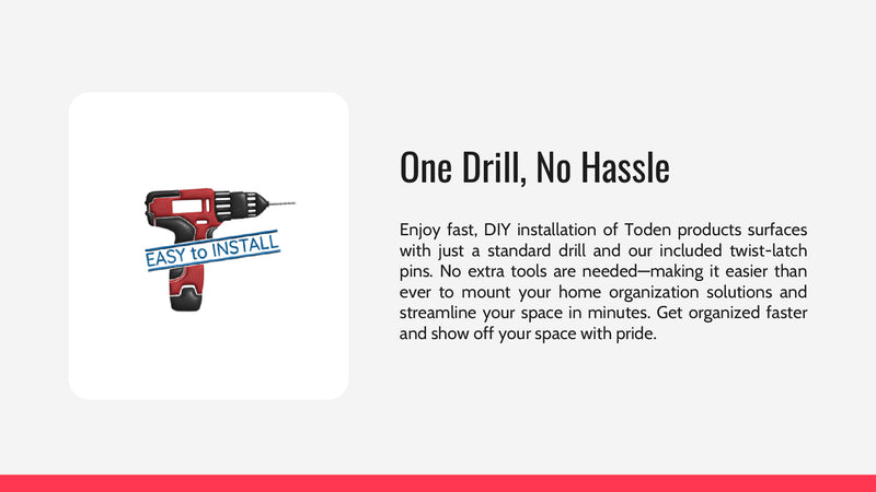 Wall mounting Toden products require less screws and less supports which makes building custom wall mounted storage way easier than anything else on the market.