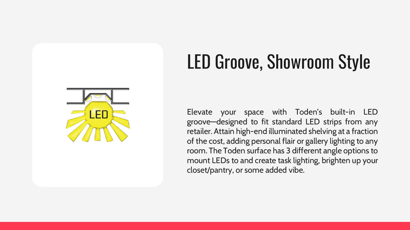These end caps make it easy to hide cords if you are running an LED strip. They also hide any imperfections that could have happened when cutting the Toden surface. I use these on all my Toden shelves.