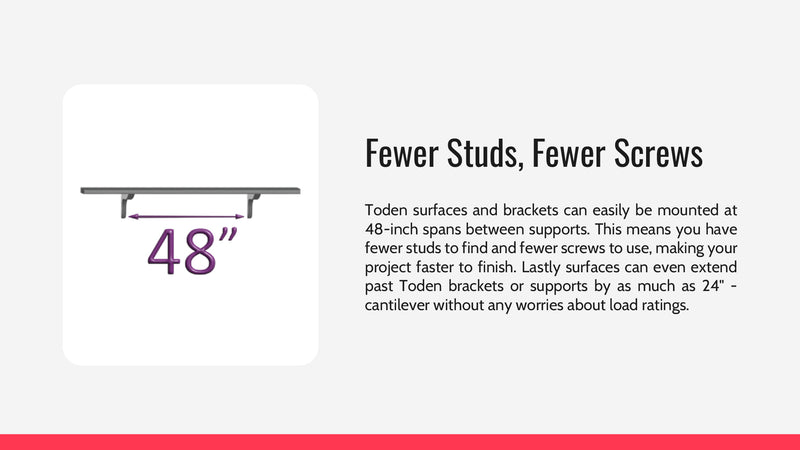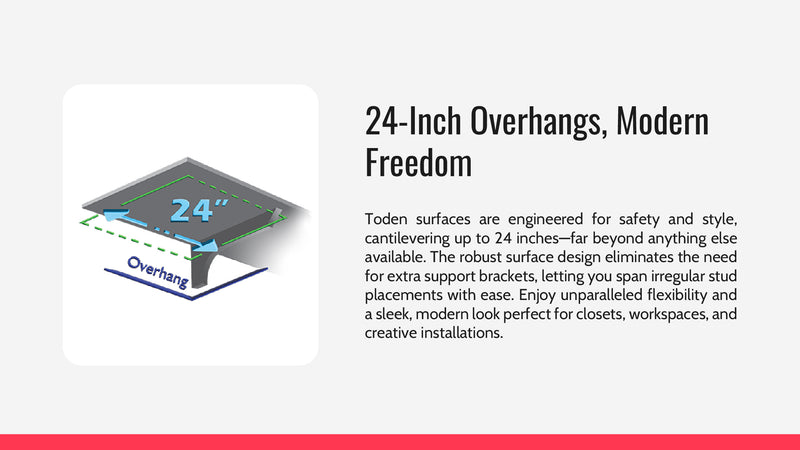 Toden products have longer spans, allow up to 24" overhangs, heavy duty load ratings and easy to install with snap-lock pins.
